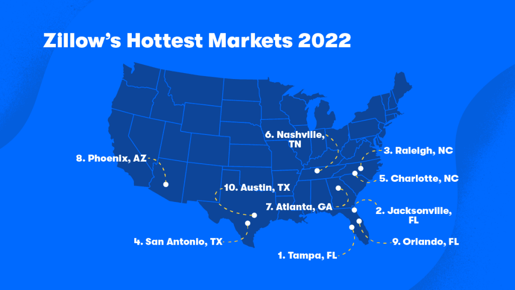 The housing market in 2022 is expected to remain hot overall, with many of the same trends that drove the market to new heights this year still firmly in place as we head into the New Year. But while all of the nation’s 50 largest markets are expected to grow healthily in 2022 and sellers nationwide should expect to remain in the driver’s seat, there can be only one Number One – and Zillow expects Tampa to top the list, with a host of relatively affordable and fast-growing Sun Belt markets following closely behind.